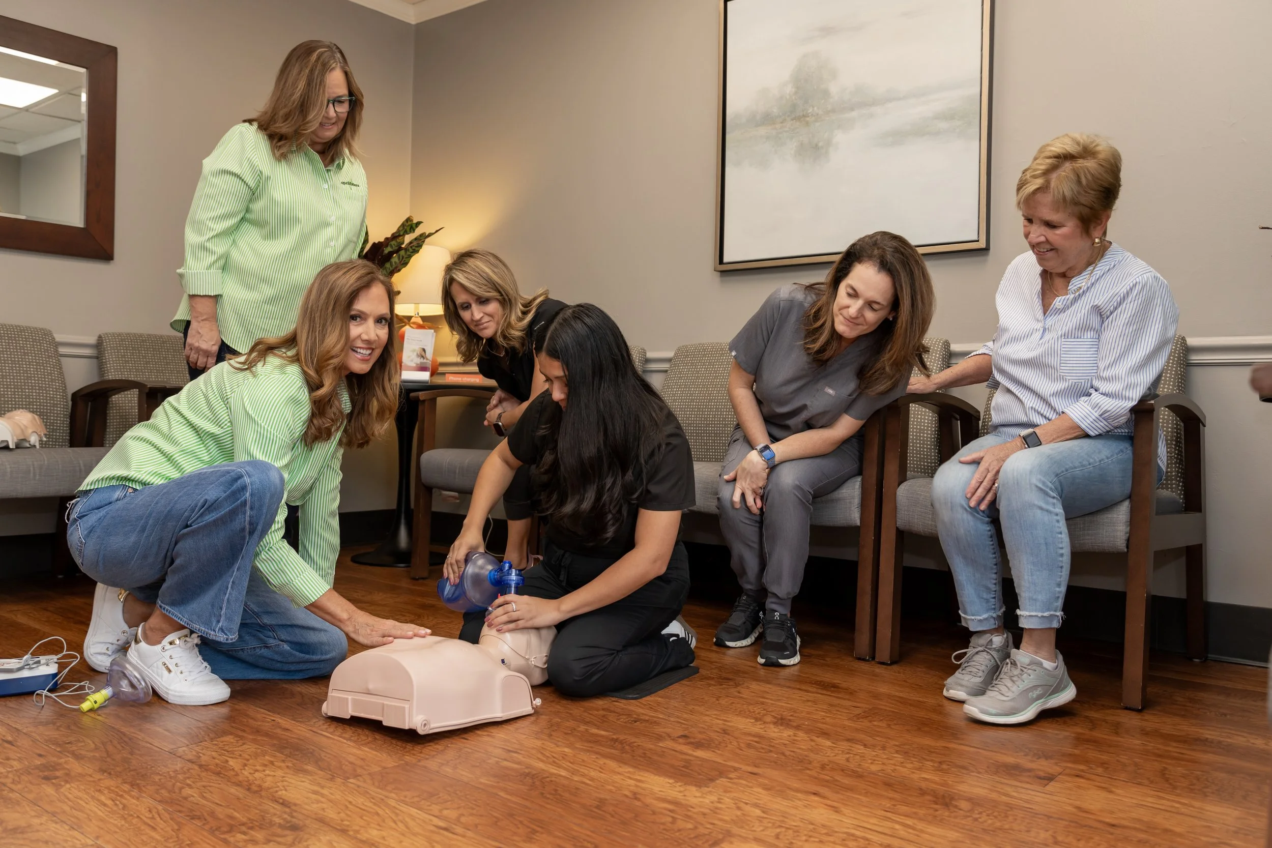 Each team receives a clinical-grade kit shipped to their practice, including an adult + infant manikin, AED trainer, bag mask, and instructional setup.